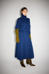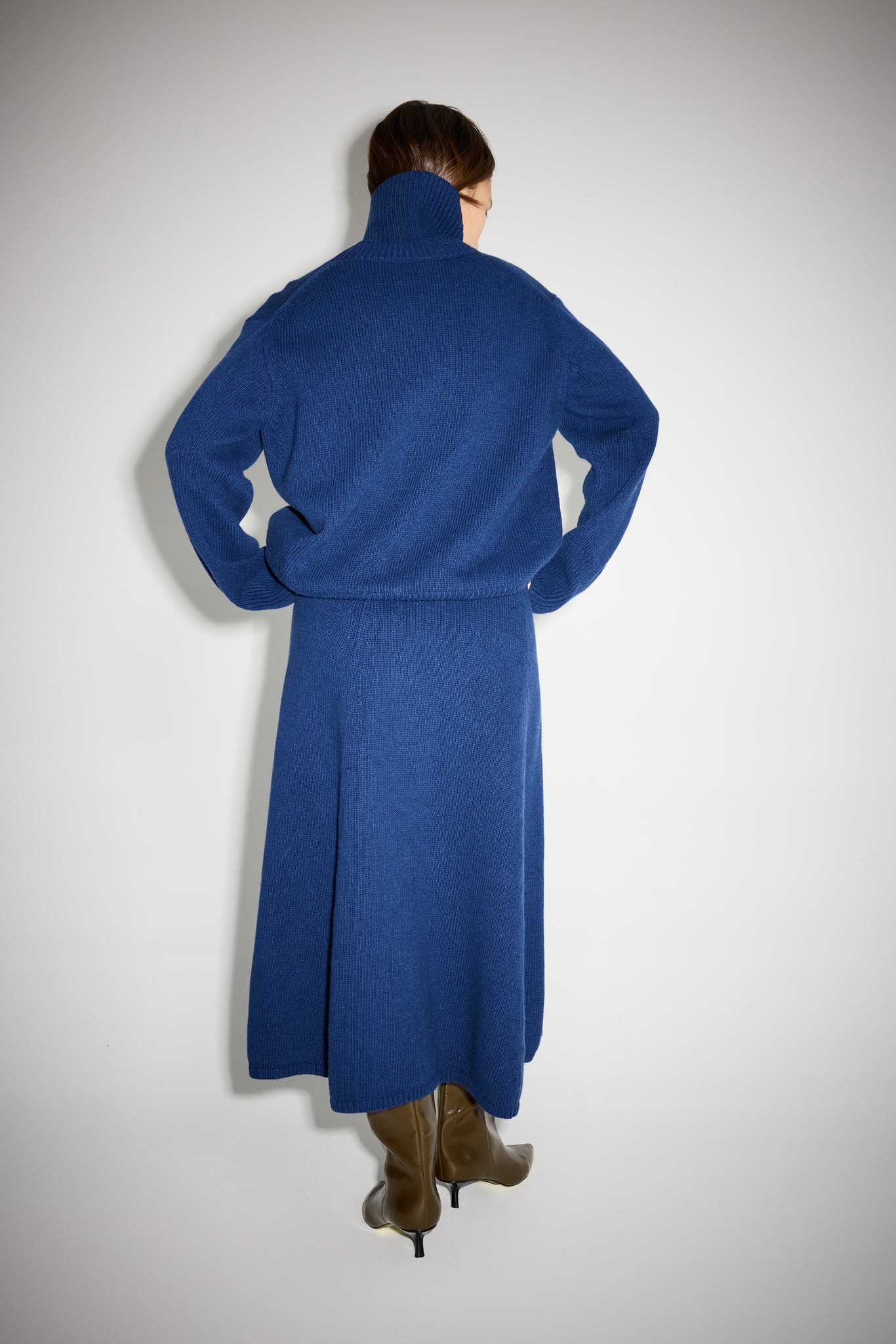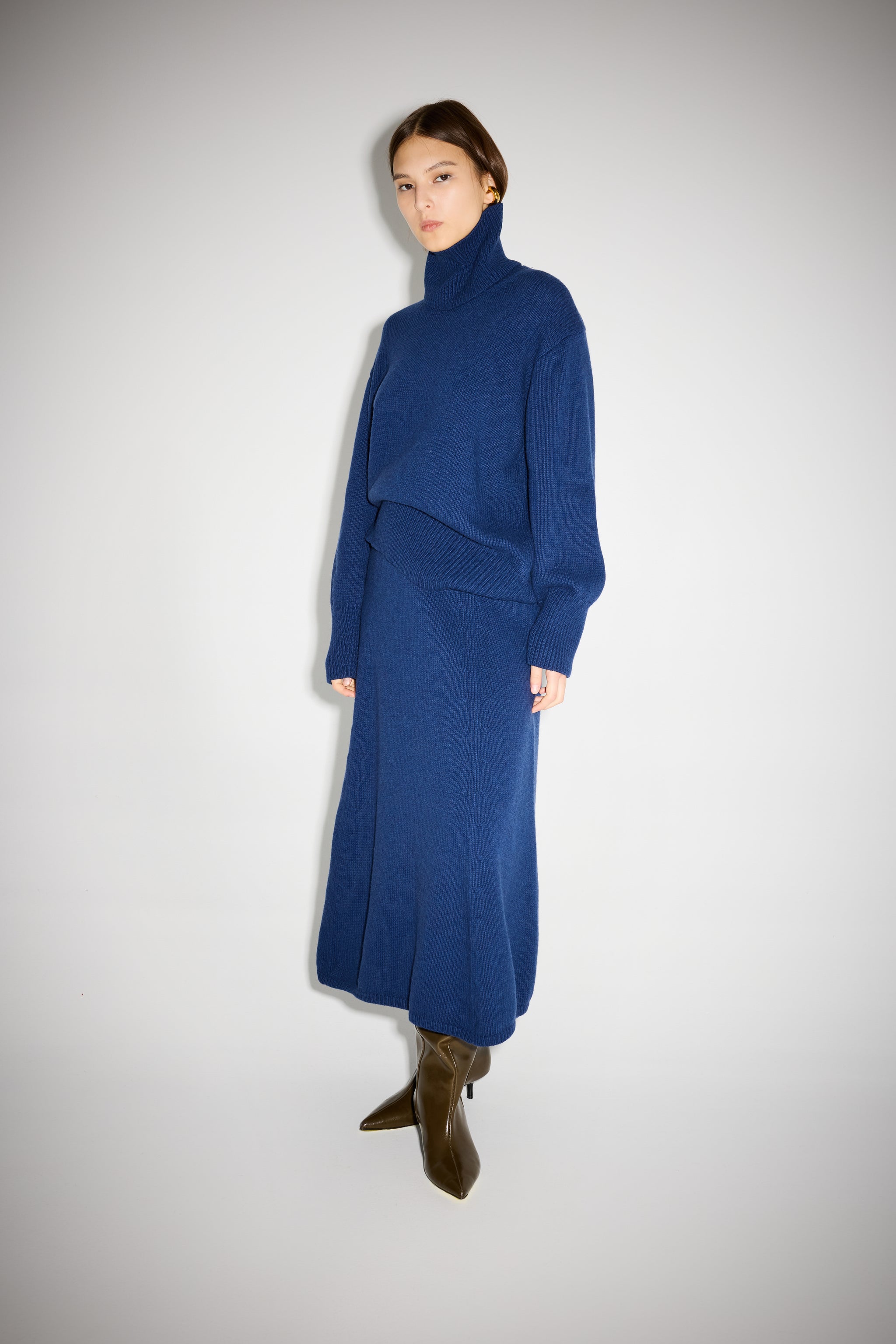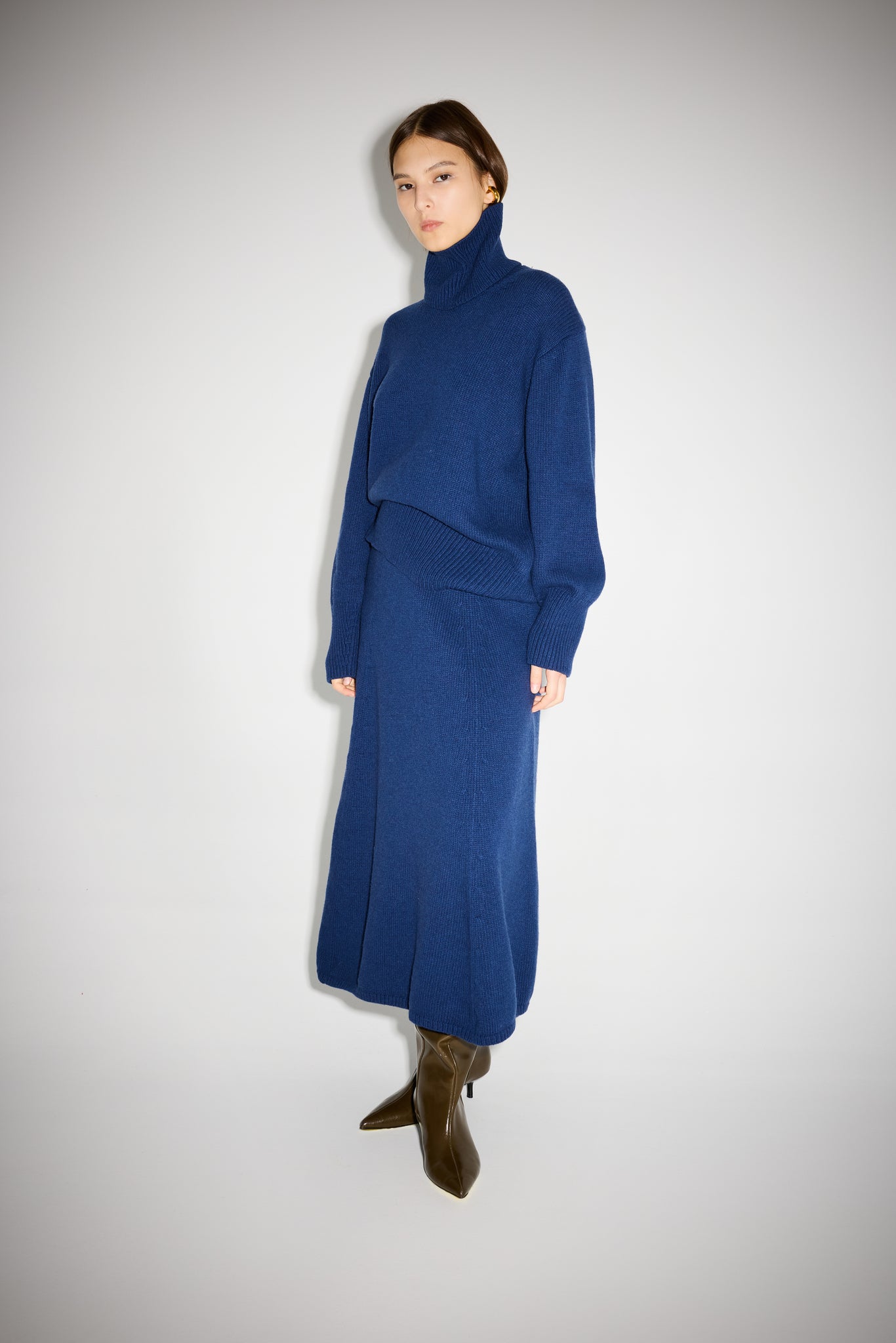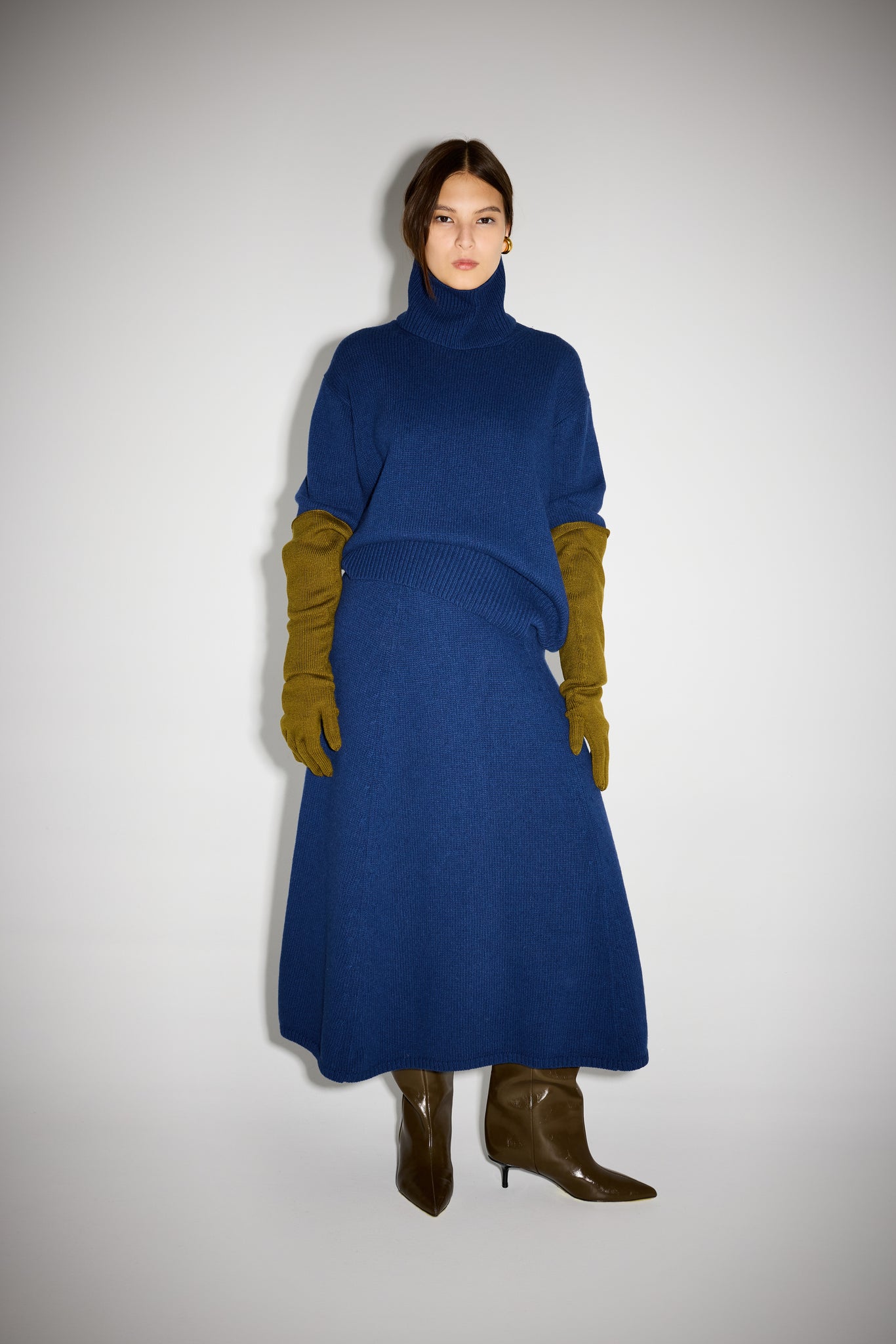 Loose fit sweater with adjustable collar and A-silhouette midi skirt.